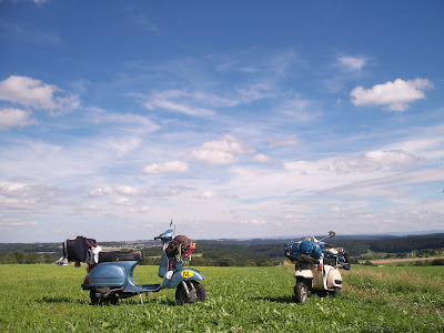 Lasciamo l'Olanda molto tardi..siamo completamente tuonati dalla sera prima ed è mezzogiorno quando ci alziamo..il tempo di smontare e caricare le due pulzelle e si parte..l'acqua ormai ci accompagna da giorni e quando esce qualche sprazzo di sole sembra manchi qualcosa..la tappa di oggi prevede una sosta vicino a Bonn perchè sulla cartina sono segnati molti campeggi..ci perdiamo come al solito e siamo costretti a comprare la cartina stradale dell'Olanda per uscire senza incontrare altri simpatici omini in divisa..tra stradine, paesini e personaggi aassurdi arriviamo al confine..chiediamo informazioni ad un signore arzillo e ci dice alla fine"are u from Italy?" e noi "Yes.." lui sorride e dice "Please kill Silvio"..presi bene per la bella figura che si fa quando sei all'estero risaltiamo in Vespa e cerchiamo di avviinarci alla Germania..la giornata è noiosa, una pioggia battente non ci molla mai e verso le 7.00 siamo nella Germania più selvaggia..solo strade a scorrimento veloce e di un paese neanche l'ombra..il sole inizia a scendere e la pioggia non finisce..di indicazioni per campeggi neanche l'ombra..prende molto male..non sappiamo ancora dove dormire e sono le 8.00..spesa veloce in un Penny market on the road..quuando chiediamo alla cassiera dove trovare il sale resta perplessa e ci fissa per 30 secondi senza pronunicare una parola..è allibita..vabbè fanculo al sale, la priorità è il campeggio..iniziamo un lungo pellegrinaggio tra paesini sperduti chiedendo informazioni a chiunque..la risposta è sempre la stessa "alle richtunge" e noi "ja..aus italien"..all'ennesimo personaggio incontrato chiediamo informazioni per un campeggio e sorpreso decide di scortarci..in effetti è buio, diluvia e un pò di culo non guasta mai..montiamo il tutto e decidiamo che il giorno dopo l'obiettivo è "macinare kilometri su kilometri"..